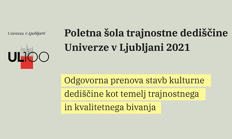University of Ljubljana in cooperation with ICOMOS Slovenia, and under honorary patronage of Slovenia National Commision for UNESCO, has organised its first Summer School of Sustainable Heritage titled Sustainable Heritage 2021 Responsible Renewal of Cultural Heritage Buildings as the Basis of Sustainable and High-quality Living.