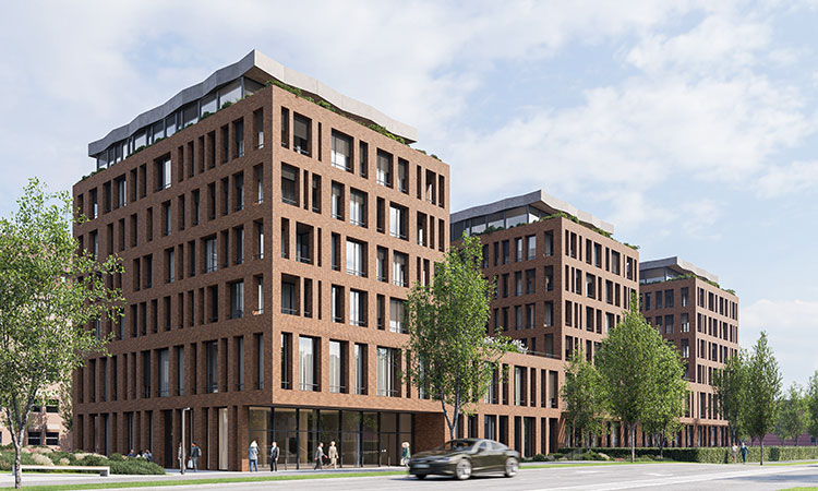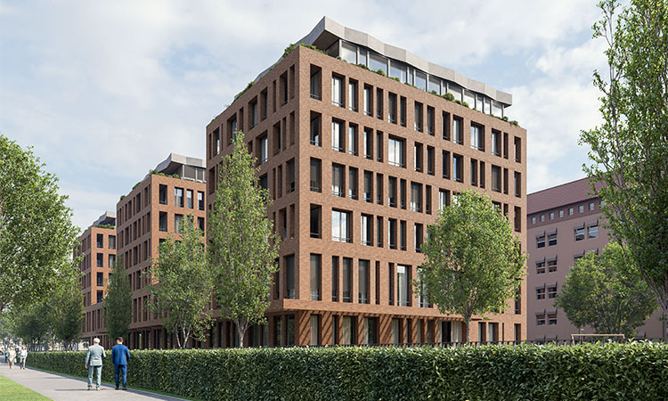 On the shared ground floor and first floor, the building will house a kindergarten, a library, a multipurpose hall, and offices for the district community. Apartments are planned in three residential towers.